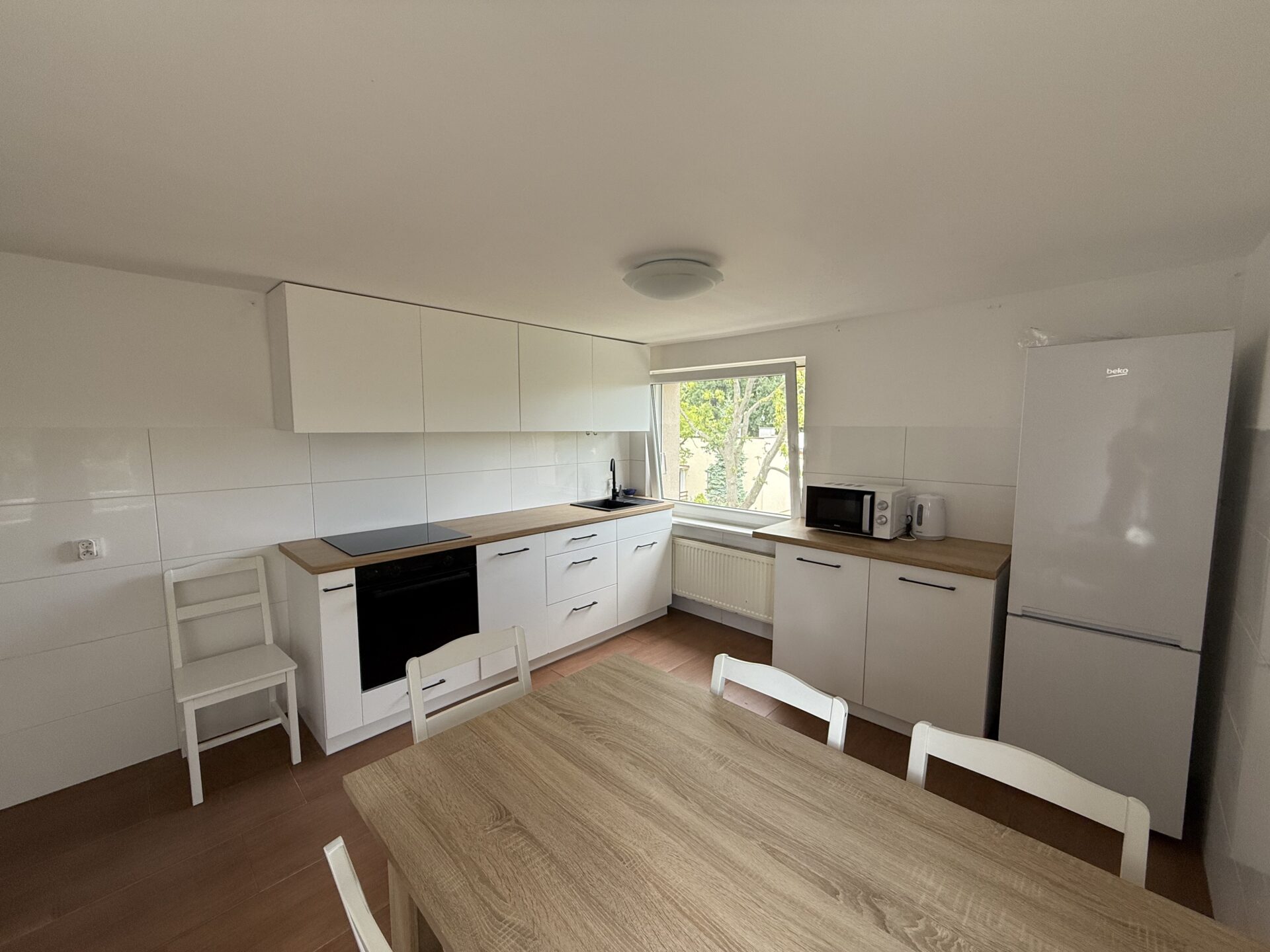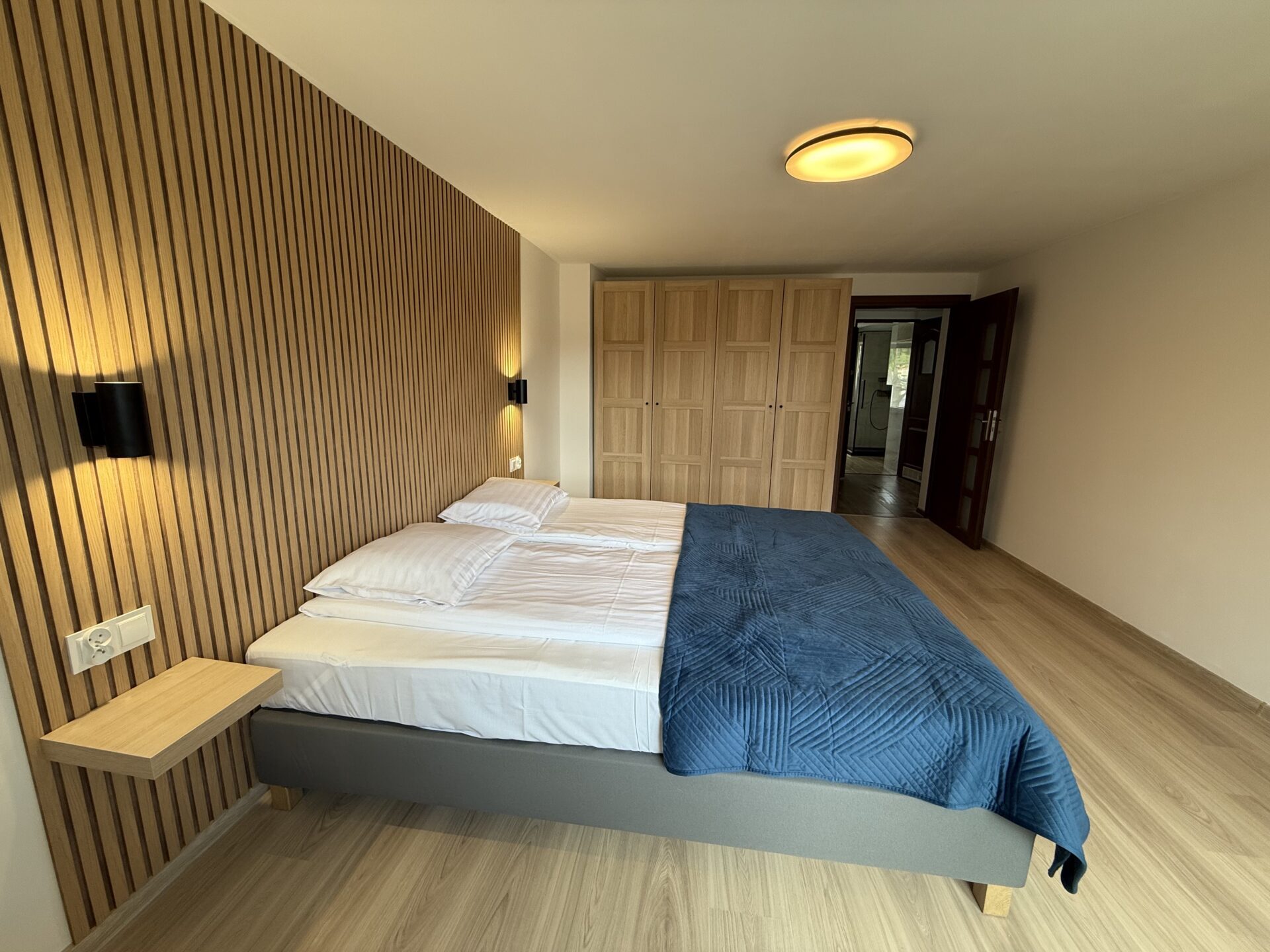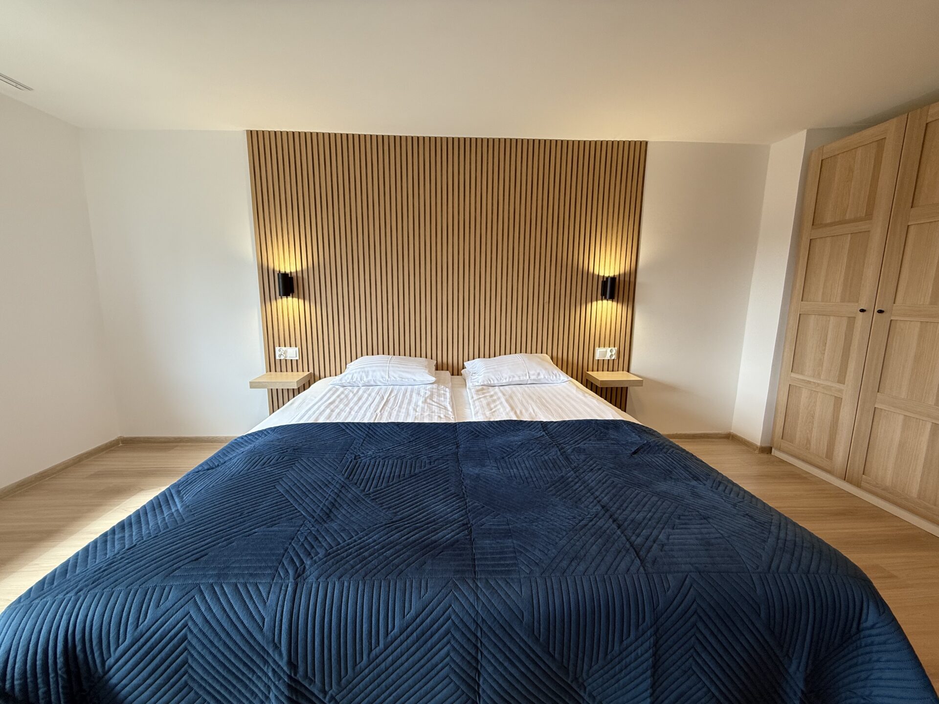 Apartament przeznaczony jest dla sześciu osób i oferuje wygodną, funkcjonalną przestrzeń urządzoną w jasnych, nadmorskich barwach. Składa się z dwóch przytulnych sypialni, w których znajdują się dwa łóżka małżeńskie oraz rozkładana sofa dla dwóch osób. W apartamencie znajduje się również w pełni wyposażona kuchnia, umożliwiająca samodzielne przygotowywanie posiłków, oraz przestronna łazienka z prysznicem. Duże okna zapewniają naturalne światło i widok na okoliczną zieleń, tworząc przyjemną, relaksującą atmosferę.